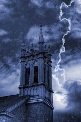 The above is also a belfry at night, and the photographer happened to catch the photo just as a lightning bolt was unleashed … pretty incredible! (Also, look at the cloud formation just at the bottom of the lightning. Looks like an upturned face, if I ever saw one!! But what’s different here? Right, no lights on upstairs where the bells are hanging. And again, I see no bats around.